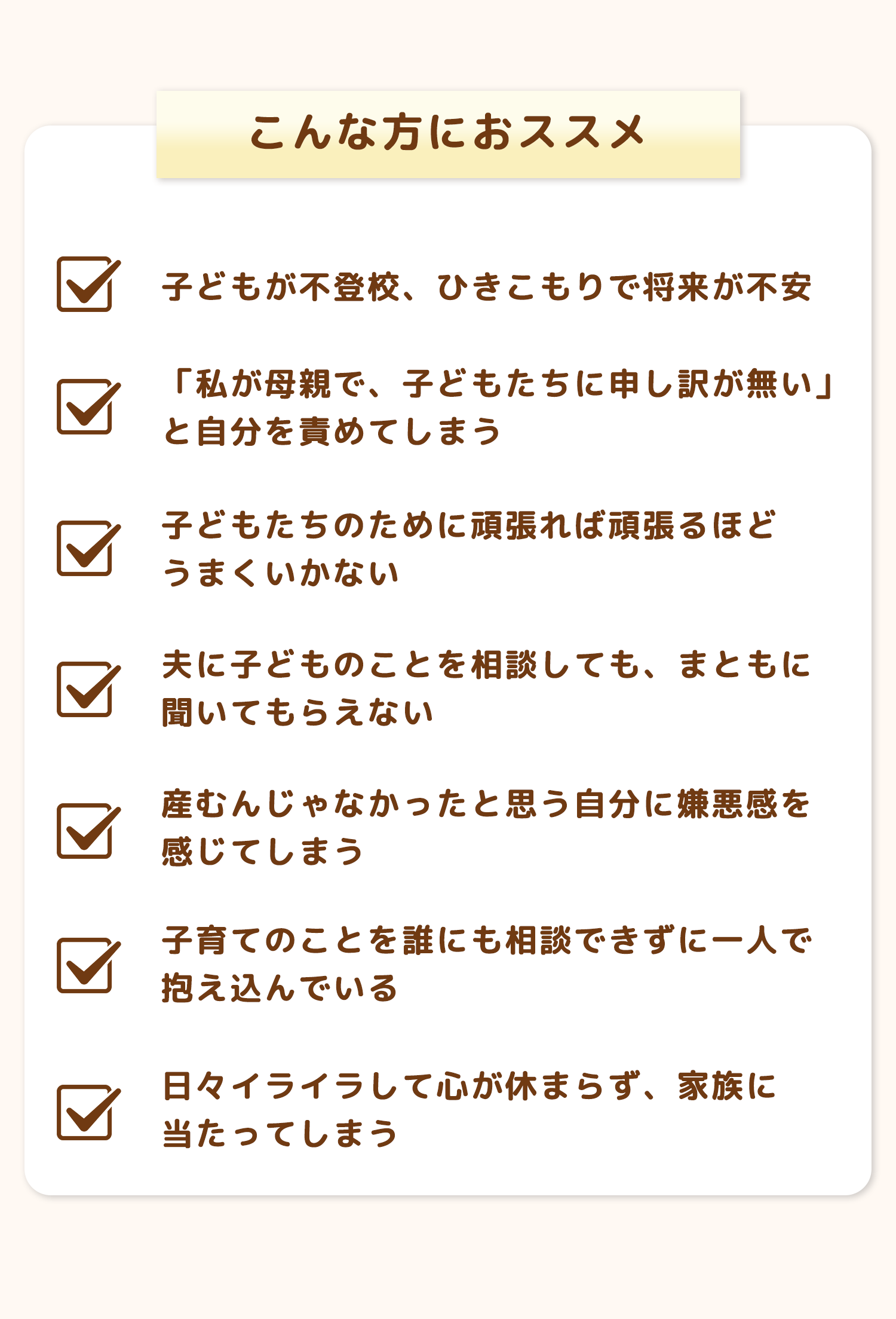 離婚後、実家に戻り、片親で自分なりに頑張っていても忙しさにかまけて、息子に十分かまってやることができず不登校にしてしまったことで、祖父母に対しても長女に対しても、申し訳ない気持ちで自分を責める日々でした。