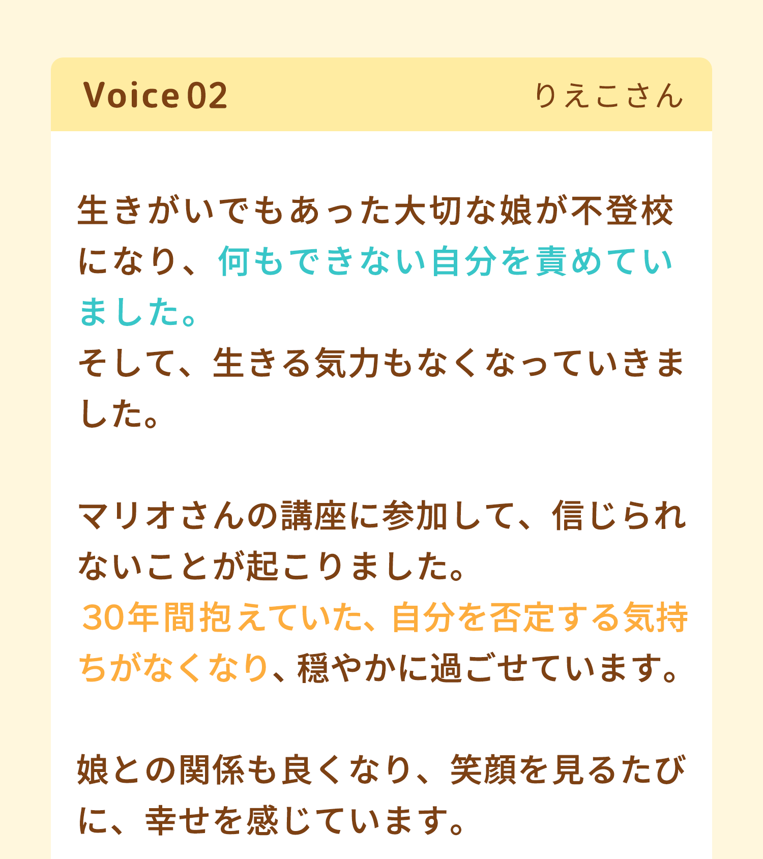 講座を受講し、いつの間にか捉え方が変わり、今は深く悩む事なく自分のやりたい事に向かって進み始め幸せを感じています。