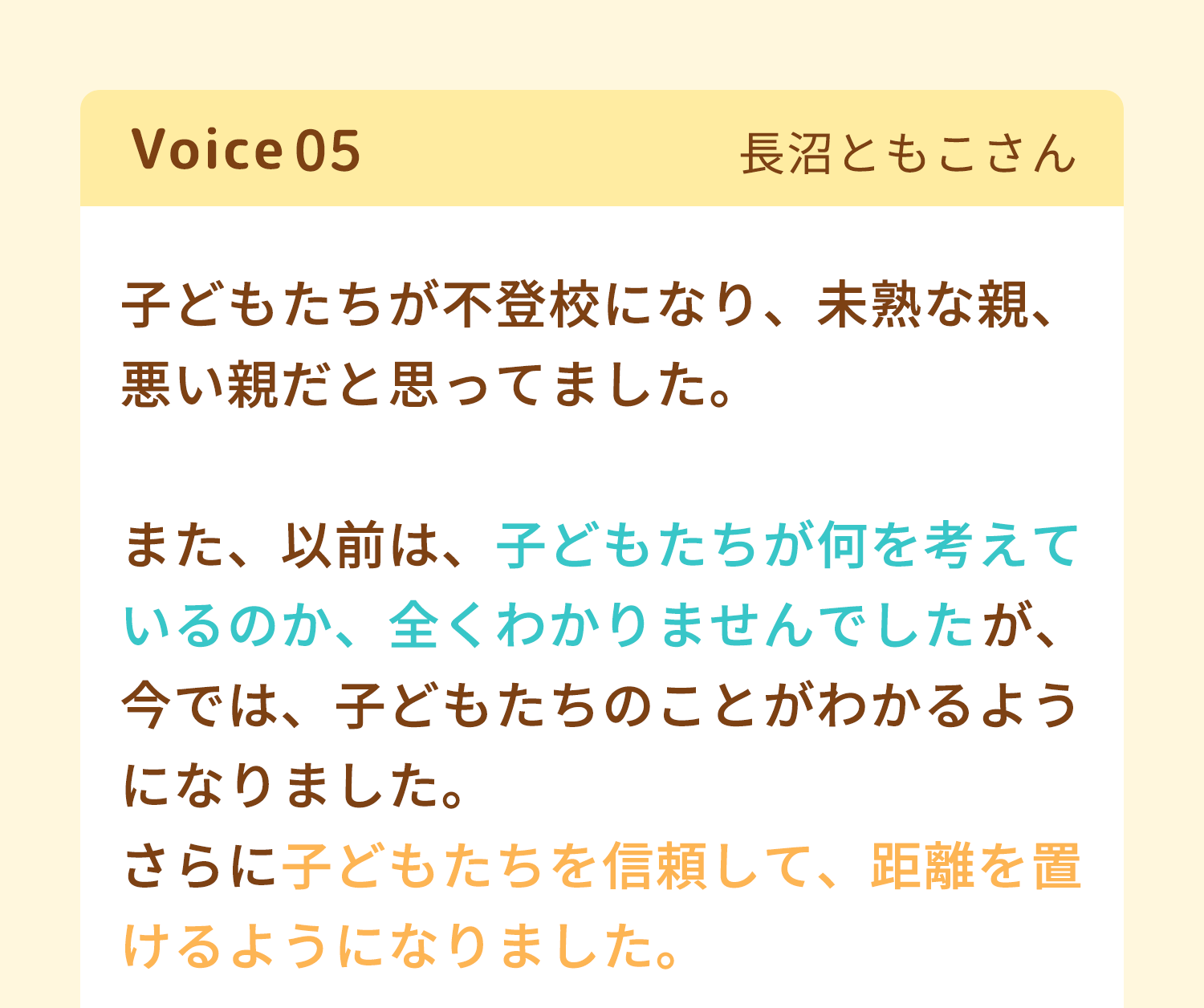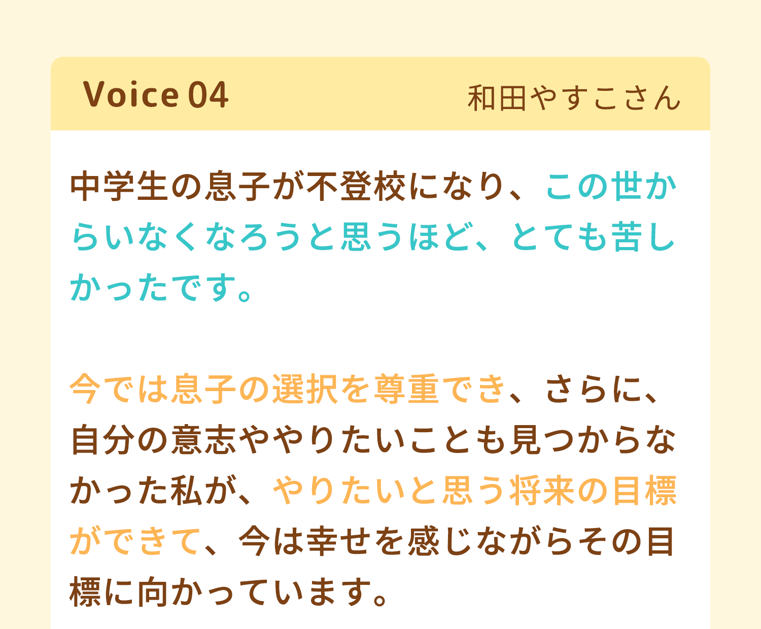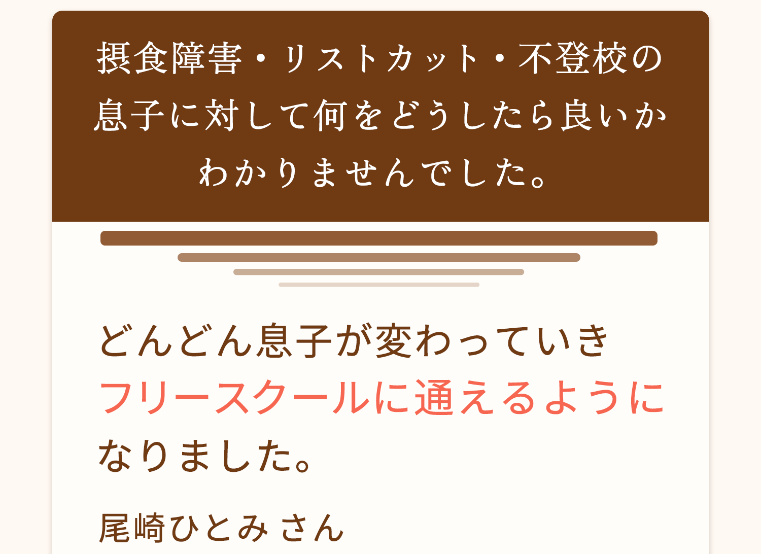 昼夜逆転し、無気力状態になり1日中ゲームや動画ばかり見ているだけの毎日だった子どもが自分自身を取り戻し高校も卒業し、一人暮らしを始め、自分の力で好きな道を歩んでいます。