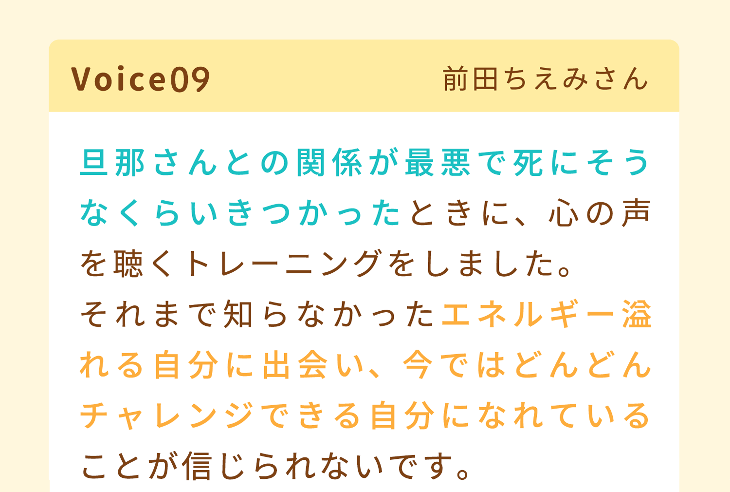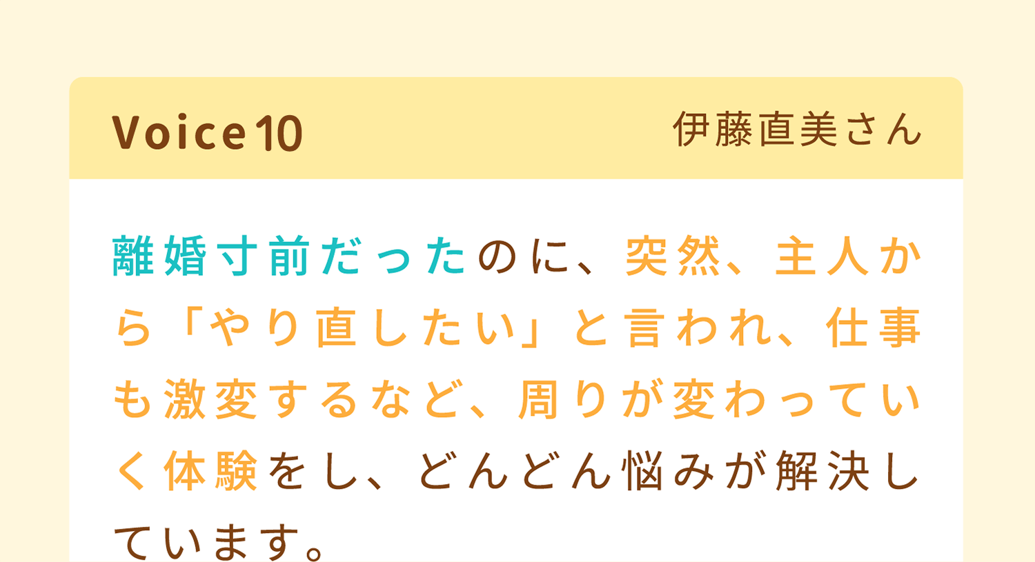 実際アドバイス通りに行動したことで、悩みがなくなり、本来の自分たちの人生を楽しめるようになりましたし、主人との関係も問題に前向きに取り組むことでよくなりました。