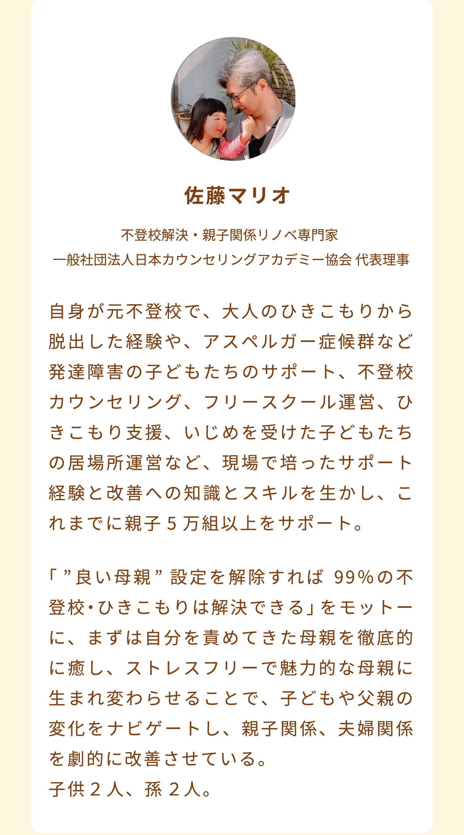 解決志向、承認と愛を持った言葉かけ、良い母親という幻想を手放す方法、理想と現実のギャップに苦しまない方法、など解決するために必要な知識は全部佐藤さんからリアルに学び取ったと言っても過言ではありません。